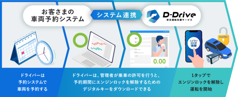 共用車管理に適した車載機とデジタルキーを活用し、「鍵の受け渡しの無人化」サービスの提供を予定しています。「D-Drive」とお客さまの「車両予約システム」を連携することで、ドライバーは予約日時にデジタルキーを利用して車両のエンジンロックの解除、ドアロックの開錠することができます。車両返却時には、車両のエンジンをロック、ドアロックの施錠をすることができます。鍵の受け渡しを無人化ができるため、前述の「アルコール・インターロック」と、業務効率化が両立できます。